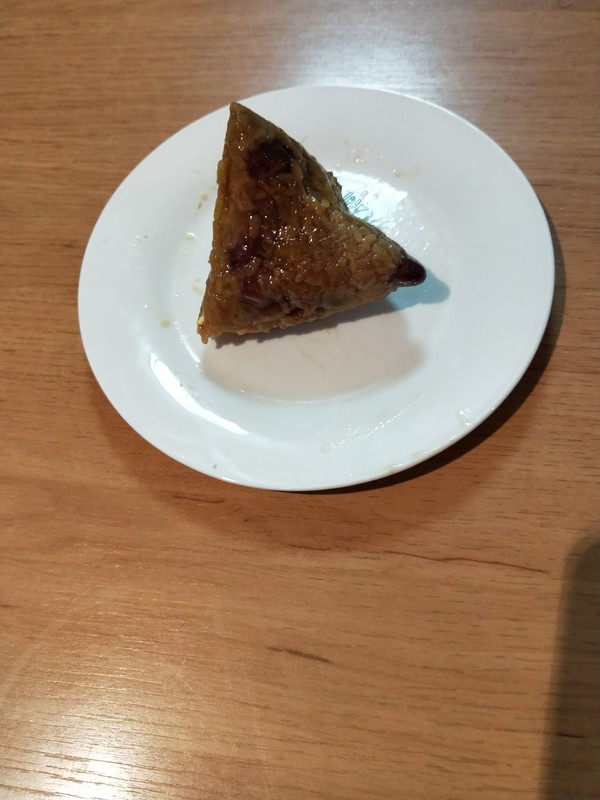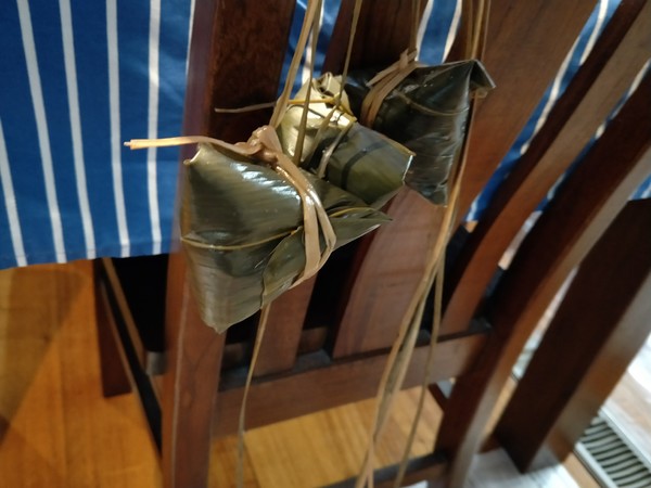 6.包粽子。每個(gè)粽子里加糯米,一塊五花肉,一個(gè)咸蛋黃,一個(gè)香菇,一個(gè)板栗,再加糯米包好。在煮開(kāi)的鍋中煮2個(gè)小時(shí)。