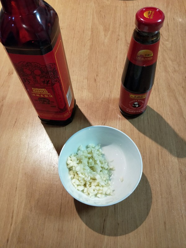 輔料:蠔油(1湯匙腌,2湯匙炒)、曬油(1湯匙腌,1湯匙炒)、麻油(1湯匙腌)、酒(1湯匙腌)、糖(1湯匙腌,1湯匙炒)、鹽(半茶匙腌,半湯匙炒)、五香粉,醬油(適量腌)、蒜頭(2顆)