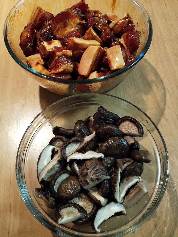 香菇泡一晚上,五花肉用上述的輔料腌一個(gè)小時(shí)
